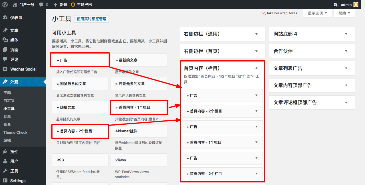 请将“首页内容 - 1/2/3个栏目”和“广告”小工具添加到首页内容(栏目)区域。